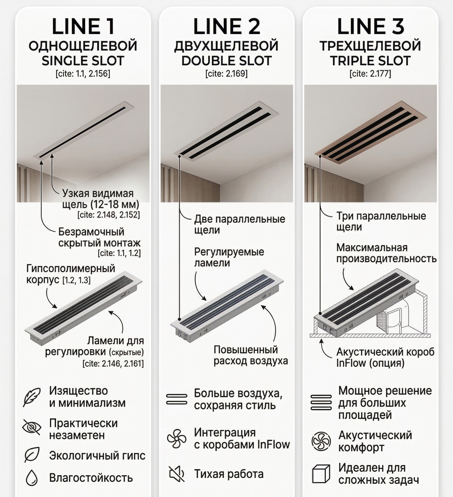 - Line 2 (Double-slot): Ideal for larger spaces, providing increased airflow without sacrificing aesthetic quality.